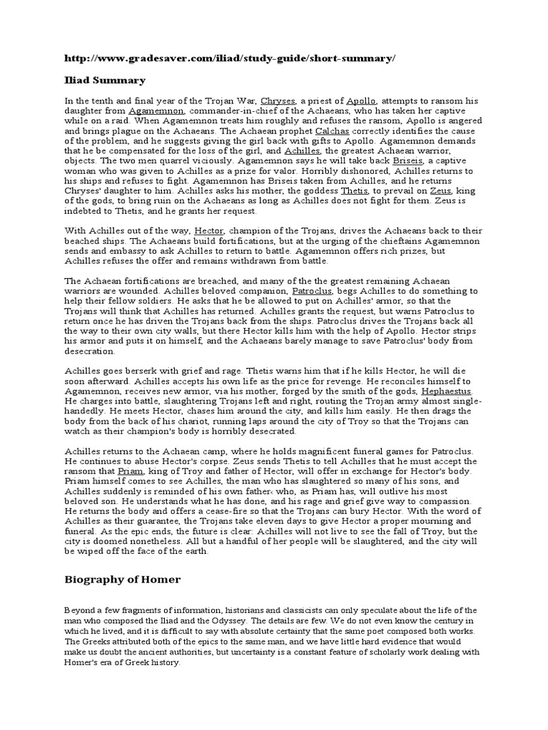 Iliad Short Summary Homer Character List Major Themes Pdf Hector Trojan War